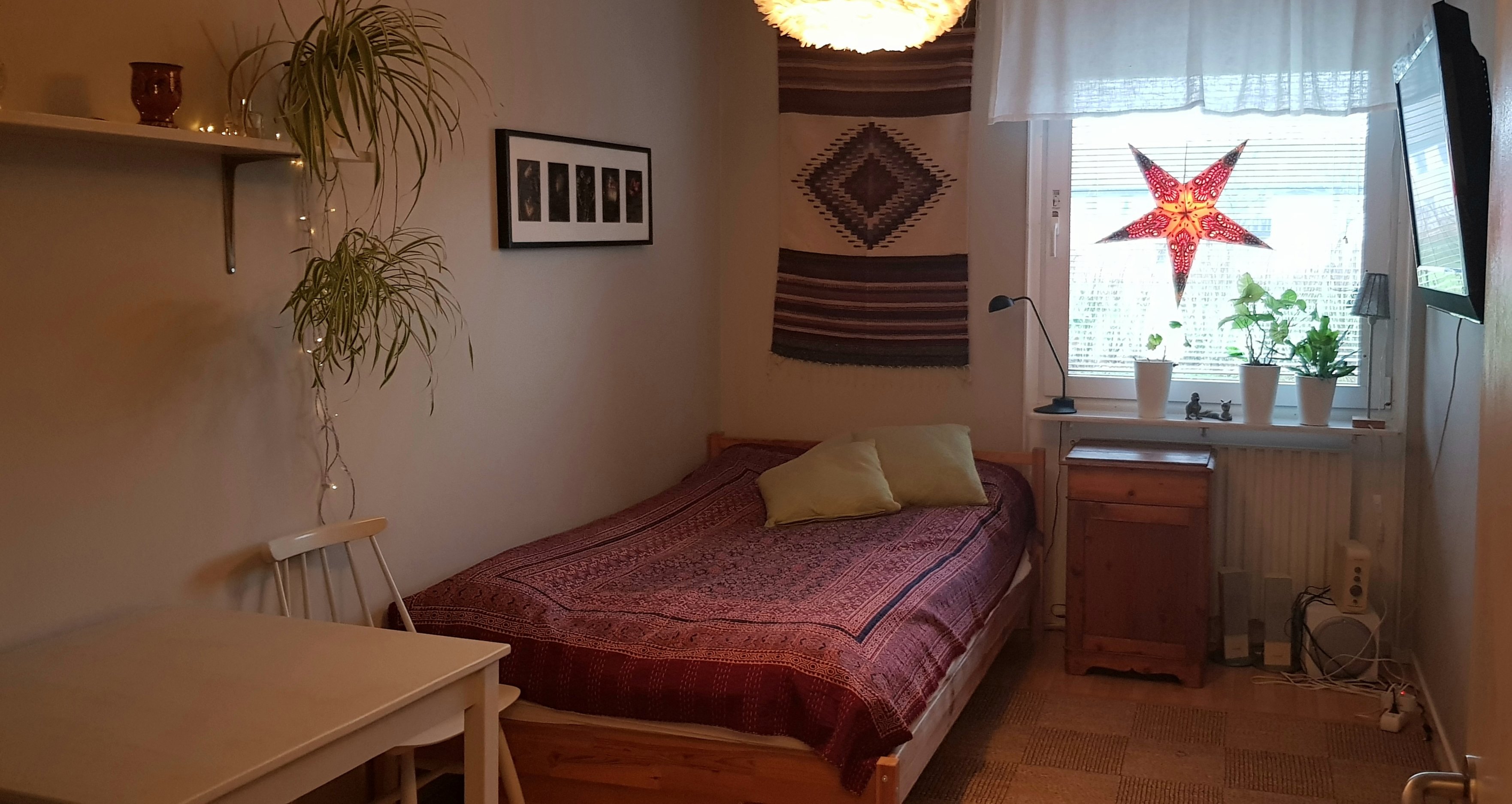 Jag hyr ut 1 rum i min 97 kvadratmeter stora lägenhet. Rummet är ca 12 kvadratmeter och möblerat. Strax intill rummet finns ett stort badrum och ett kök som delas med hyresvärden. Det finns vissa regler som vi skriver in i kontraktet kring städning, återvinning, matlagning. Jag söker en skötsam och ansvarsfull kvinna att dela min trevliga lägenhet med. Veckopendlare har företräde och kan få reducerad avgift. Lägenheten ligger 2,5 km från centrum och universitetet.